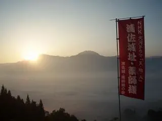 登山道の各所にのぼりを立てながら、山頂の城址に付く頃には越後三山の雲海がダイナミックに広がり、ご来光に会えました。すごかったです。