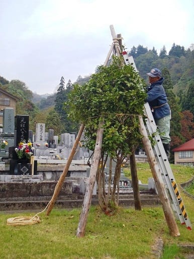 雪の降らない地域の人にはなかなか分からない仕事ですが、毎年こうやって境内の木々や草花を冬の重い雪から守るために囲いをします。