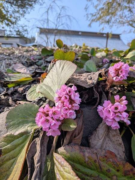千手院のしだれ桜の下に咲くヒマラヤユキノシタもモコモコと葉と花が立ち上がり始めました。