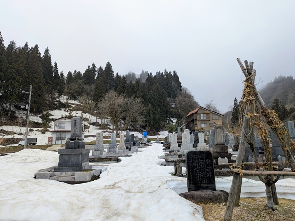 お墓の後ろの山が薬師山、戦国時代の浦佐城跡ですが、今年は結構木々が折れたり、昨年より雪でやられているようです。雪があるうちに(作業がしやすいので)木を切りに行きたいと思っているのですが、今年は門前区長になり、なんか思っているだけで実行が伴わないかな~なんて、今から後ろ向きでいます(T-T)